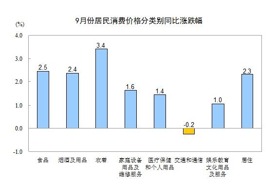 9月份,非食品價(jià)格環(huán)比上漲0.4%。其中,衣著、交通和通信、居住、醫(yī)療保健和個(gè)人用品、娛樂教育文化用品及服務(wù)價(jià)格分別上漲1.1%、0.4%、0.3%、0.3%和0.3%;煙酒及用品、家庭設(shè)備用品及維修服務(wù)價(jià)格持平(漲跌幅度為0)。居住中,水、電、燃料價(jià)格上漲0.3%。