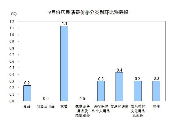 9月份,全國居民消費(fèi)價(jià)格總水平環(huán)比上漲0.3%。其中,城市上漲0.3%,農(nóng)村上漲0.4%;食品價(jià)格上漲0.2%,非食品價(jià)格上漲0.4%;消費(fèi)品價(jià)格上漲0.4%,服務(wù)項(xiàng)目價(jià)格上漲0.3%。
