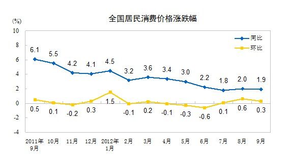 2012年9月份,全國居民消費(fèi)價(jià)格總水平同比上漲1.9%。其中,城市上漲2.0%,農(nóng)村上漲1.7%;食品價(jià)格上漲2.5%,非食品價(jià)格上漲1.7%;消費(fèi)品價(jià)格上漲1.8%,服務(wù)項(xiàng)目價(jià)格上漲2.3%。1-9月平均,全國居民消費(fèi)價(jià)格總水平比去年同期上漲2.8%。
