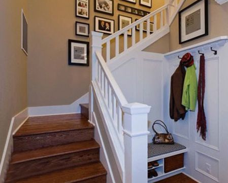 家中空間太小沒有衣帽間怎么辦,上面的這種拐角衣帽間設(shè)計(jì)則為你提供大大的便利,窄小的拐角可以放置下鞋柜和衣帽架等設(shè)施,而簡(jiǎn)約的白色不僅延續(xù)了整個(gè)樓梯的配色,而且也將衣帽間巧妙的隱藏了起來(lái),如此精巧設(shè)計(jì),簡(jiǎn)約大方,讓人喜愛不已。
