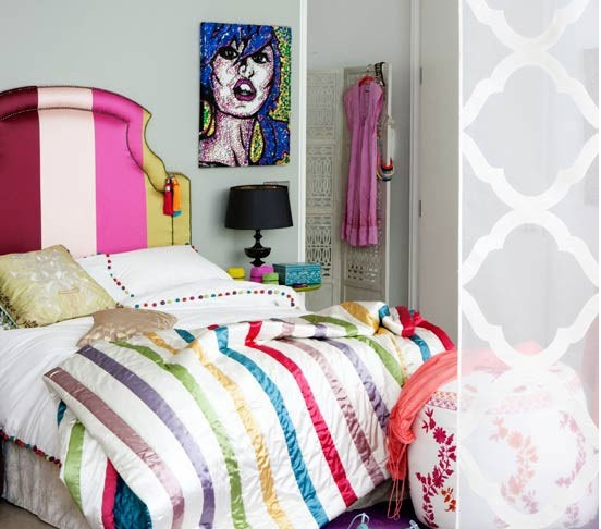 仿佛是打開的薰衣草一般的夢(mèng)幻淡紫撲面而來(lái),那樣清淺的顏色糅合了紫色的沉郁和白色的 純粹,再搭配精致的粉色,更添一種浪漫風(fēng)情,斑斕的碎花床罩,突出的是一種自然詩(shī)意朦朧,明快的藤黃更是帶來(lái)了一種春一般的溫暖感覺。