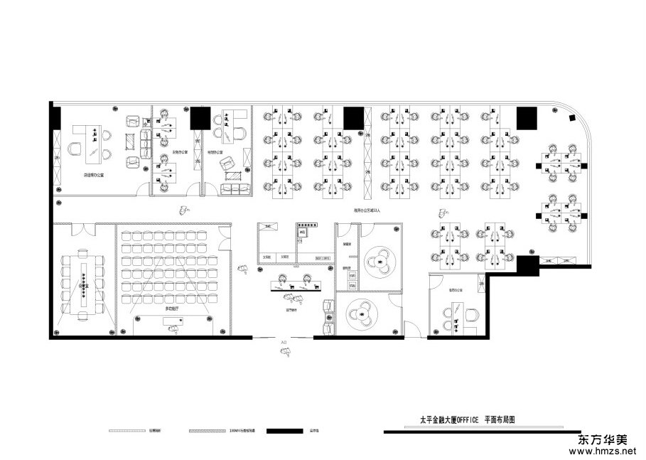 ▄設(shè)計(jì)風(fēng)格定位: 本項(xiàng)目在風(fēng)格設(shè)計(jì)上以現(xiàn)代為主,要求穩(wěn)重、大方、寬敞、明亮,頂面采用鋁格柵吊頂、格柵燈等材料,使整個(gè)空間即簡約又寬敞明亮,在設(shè)計(jì)空間布局上,疏密有致,符合投資理財(cái)公司的空間布局,體現(xiàn)公司高效通透,以人為本的人性化管理。此項(xiàng)目前臺(tái)設(shè)計(jì)的偏新中式風(fēng)格,背景墻使用木紋格柵和仿石材,開放性辦公區(qū)沿用了前廳的鋁格柵吊頂、格柵燈等材料,整個(gè)空間疏密有致。 前臺(tái)背景墻的背面也立于開放性辦公區(qū)內(nèi),此面墻用作于企業(yè)精神文化墻不僅宣傳了公司企業(yè)文化,也起到了裝飾作用。